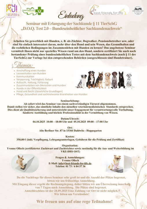 Einladung Seminar mit Erlangung der Sachkunde § 11 TierSchG